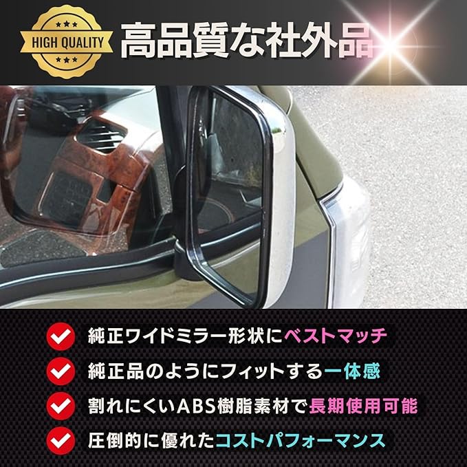 純正のワイドミラー形状にぴったり合うデザインで、愛車に自然にフィットします。割れにくいABS樹脂素材を使用し、長期間の使用が可能。純正品同様の一体感と、優れたコストパフォーマンスを実現した商品です。