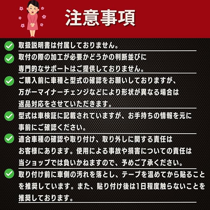 裏側に両面テープが装着されており、専門的な工具や知識は一切不要です。純正ドアミラーにかぶせるだけで、どなたでも手軽に取り付けが完了します。