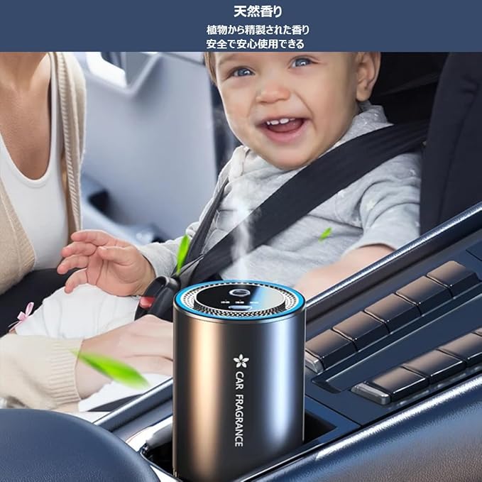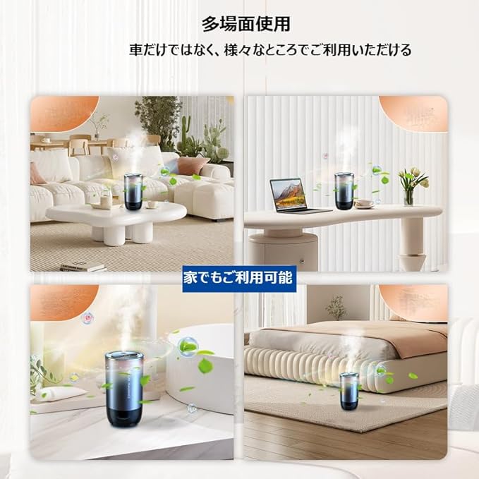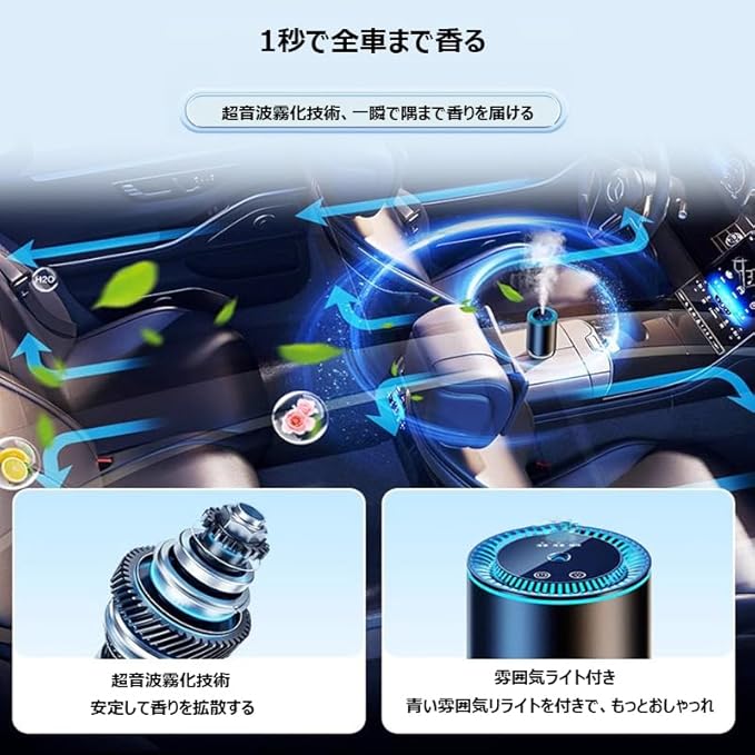超音波式のアロマディフューザー&バッテリ付き:超音波噴霧で、もっと微細ミストを噴霧して、一瞬で全車まで香りを届ける。.付きで、USB給電と.給電両方ご利用いただける。満充電で約240時間動作可能。