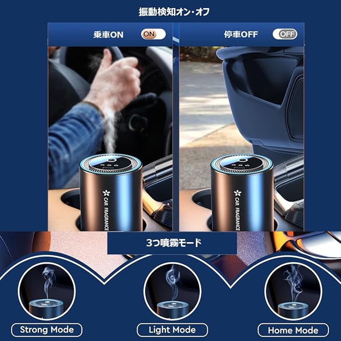 振動検知作動&3つ噴霧バターン:高感度振動センサーとスマートチップが搭載されており、エンジンの振動を感じるだけで自動噴霧開始し、香りのレベルを3段階で調整することができます。エンジンONで自動噴霧(エンジン停止前の設定を記憶)、振動無しで自動で停止して、使用後の電源の切り忘れを防げます。