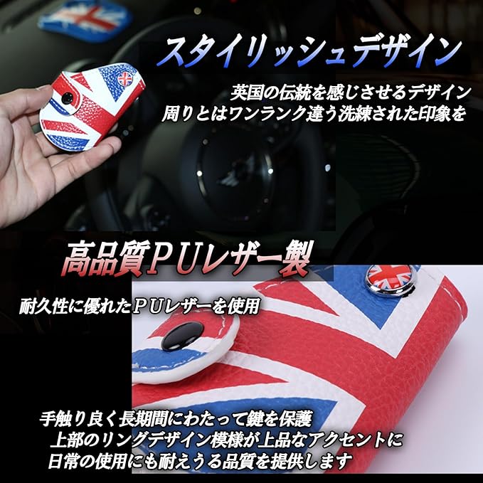 【簡単な取り付け】特別な工具は不要で、簡単にリングデザイン部のネジを緩める事で装着できます。【ギフトにも最適】このユニオンジャック柄のキーケースは、車好きの友人や家族へのプレゼントにも最適です。彼らの愛車の鍵をおしゃれに保護するアイテムとして、喜ばれること間違いなしです。