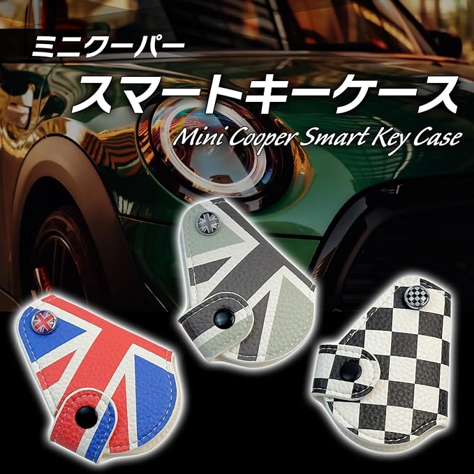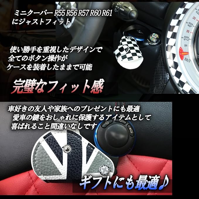 【スマートキーケース】あなたのミニ クーパー R55 R56 R57 R60 R61の鍵を、このスタイリッシュなユニオンジャック・グレーユニオン・チェッカーフラッグ柄のPUレザーキーケースで飾りましょう。英国の伝統を感じさせるデザインが、あなたのカーアクセサリーに洗練された印象を与えます。