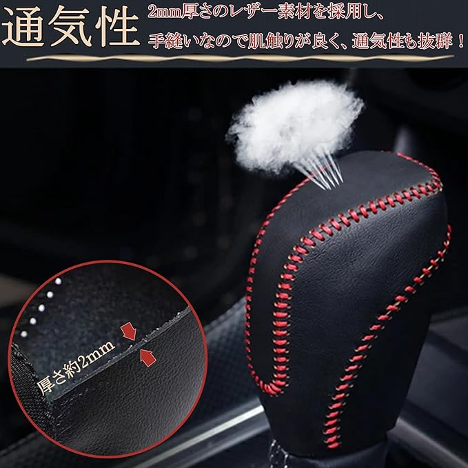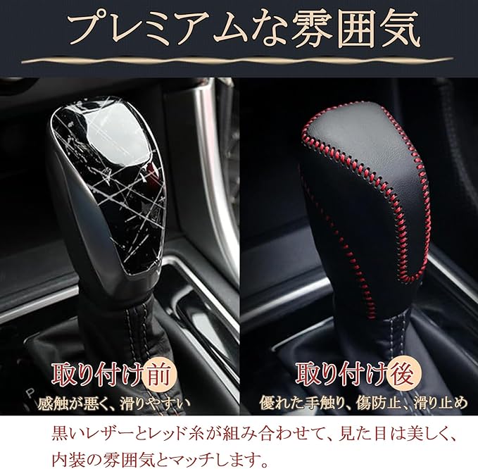 【高級感】黒いレザーと赤い糸が組み合わせて、見た目は美しく、純正シフトノブと合わせて愛車の高級感を損なわなく、内装の雰囲気とマッチします、細部まで高級を実感させできます。下端に縁取りを良い処理、 均一に穴を開けて、手縫いを採用するデザインは高級感を醸し出します。