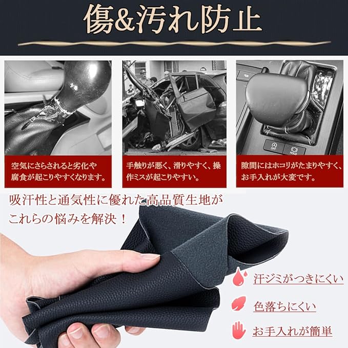 【傷&汚れ防止】シフトノブには手を触れる頻度が多いパーツ、色落ちや汗ジミがつきやすいですから、お手入れが重要です。シフトノブカバーを着用していくことで経年劣化やダメージが軽減されます。更に、爪などによる傷も防止でき、汗を吸い取る機能があります。