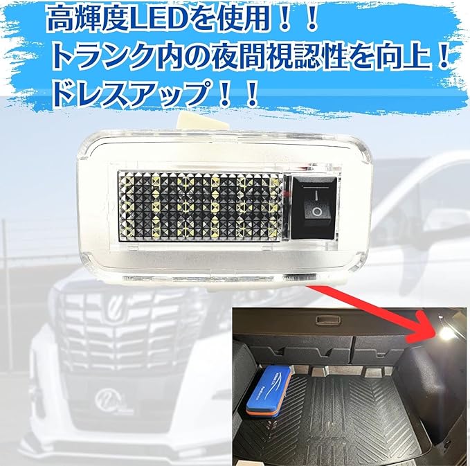 トヨタ車汎用アルファード ラゲッジランプには高輝度LEDを使用し、トランク ルームランプ 車 用に交換する事で、夜間視認性を向上します!