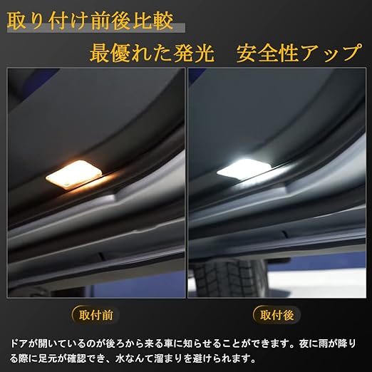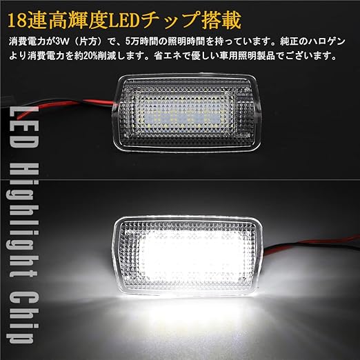 【省エネ&長い寿命】カーテシランプは消費電力が3W(片方)で、5万時間の照明時間を持っています。純正のハロゲンより消費電力を約20%削減します。専用カーテシランプは使用寿命が長く、省エネで優しい車用照明製品でございます。