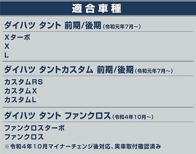 適合車種:ダイハツ タント タントカスタム LA650S/LA660S 前期/後期(令和元年7月~)、タント ファンクロス LA650S/LA660S(令和4年10月~)