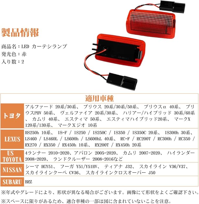 Catland トヨタ カーテシランプ LED 赤 警告灯 ドアライト 内装 プリウス 20系 30系 50系 ヴェルファイア 20系 30系 アルファード 20系 30系 プリウスPHV 50系 エスティマ 50系 ランドクルーザー 200系 レクサス ES/CT/GX/HS/IS/LS/RC/RX など適応 カーテシライト 車用 フロアライト 12V 汎用 純正交換 2個入り