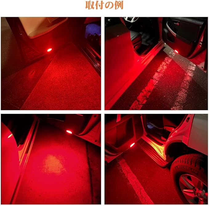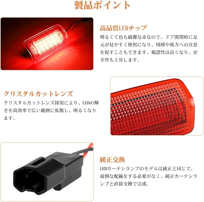 【アピール度抜群】暗い夜に、純正カーテシランプは暗くて、後車または不明な地面状況などの視認性を確保には不十分です。国内仕様の白光とは違い、北米仕様の赤色の光は個性的、夜は本当に艶やかに輝きます。ひと味違うカスタム感が漂うドレスアップ効果もあります。本製品はクリスタルカットレンズ採用により、18連(片側)のLEDチップは高発光効率で赤い光を広い範囲に光を拡散し、ドア開閉時に足元が見やすく便利になり、周囲や後方への注意を促すこともできます。視認性は良くなり、安全性も上昇します。