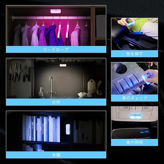 【多用ランプ】車用だけでなく、使用範囲も広いです。本製品は小型ライトなので、ポケットに入れ、何処へ持って行けます。車内物見つけ、シート照明だけでなく、停電時や災害時にも役に立ちます。また、玄関、階段、廊下、本棚などの場所さえも取り付けられます。