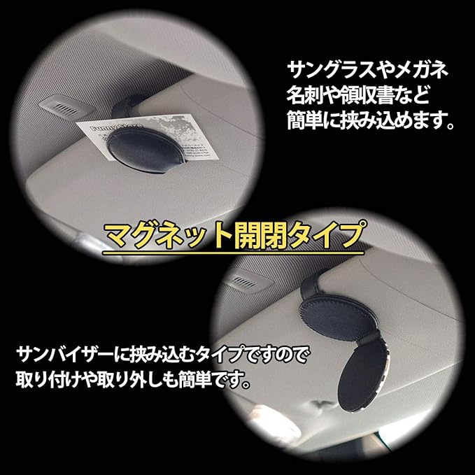運転手の視界を妨げないようにサンバイザーにしっかり固定できます。サングラス等を挟み込んでも傷つけにくいソフトフェイクレザー採用です。