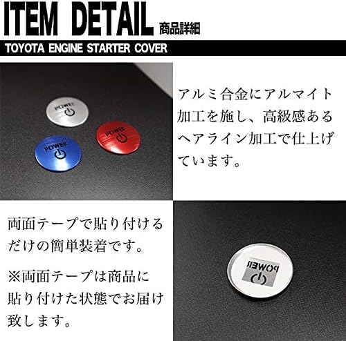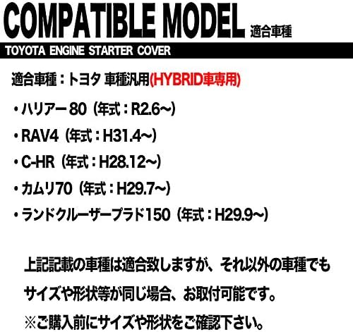 ■適合車種:トヨタ 車種汎用(HYBRID車専用) ・ハリアー 80(年式:R2.6~) ・RAV4(年式:H31.4~) ・C-HR(年式:H28.12~) ・カムリ70(年式:H29.7~) ・ランドクルーザープラド150(年式:H29.9~) 上記記載の車種は適合致しますが、それ以外の車種でもサイズや形状等が同じ場合もお取付可能です。 ※ご購入前にサイズや形状をご確認下さい。 ■サイズ:約30.9mm 約30.9mm ■素材:アルミ合金製 ■裏面両面テープ装着済み ■カラー ・シルバー ■セット内容:エンジンスターターカバー 1P