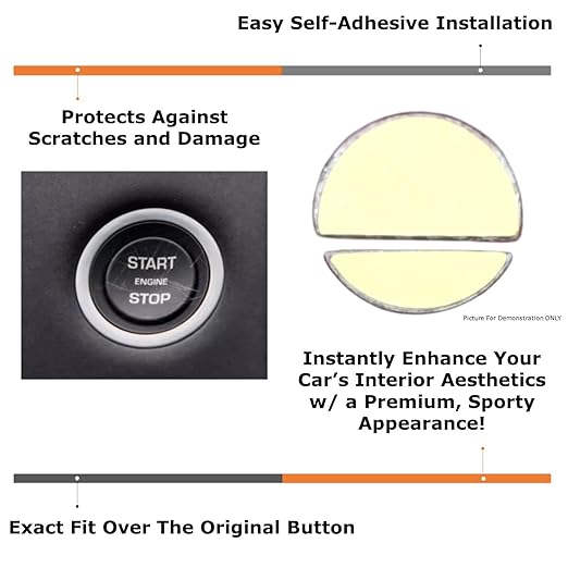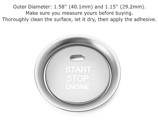 取り付けのヒント:1)元のプッシュスターターエリアを消毒用.できれいにし、ほこりや油/ワックスの残留物が残らないように完全に乾くようにします。2)裏紙をはがし、装飾カバーまたはリングを元のボタンの上に貼り付け、文字/開口部の向きが正しいことを確認します。3)十分な圧力を約2分間加えて完全に接着します。
