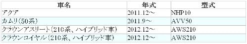 カローラアクシオ(160系、ハイブリッド車) NKE16# 2012.5〜2019.9 カローラフィールダー(160系、ハイブリッド車) NKE16# 2012.5〜2019.9 クラウンアスリート(210系、ハイブリッド車) AWS21# 2012.12〜2018.6 クラウンマジェスタ(210系) AWS215、GWS214 2013.9〜2018.6 クラウンロイヤル(210系、ハイブリッド車) AWS21# 2012.12〜2018.6