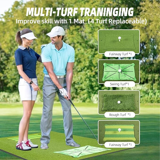 4つの交換可能な挿入マット:フェアウェイターフ、ラフターフ、2つのスイングインパクトターフの4つの交換可能な挿入芝オプションを備えたゴルフヒッティングマットは、さまざまなゴルフ練習を体験するニーズを満たします。