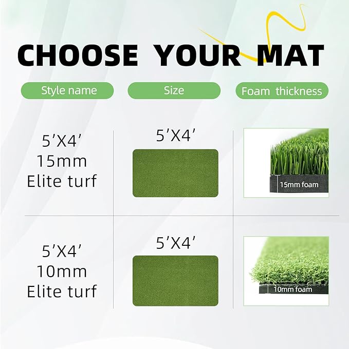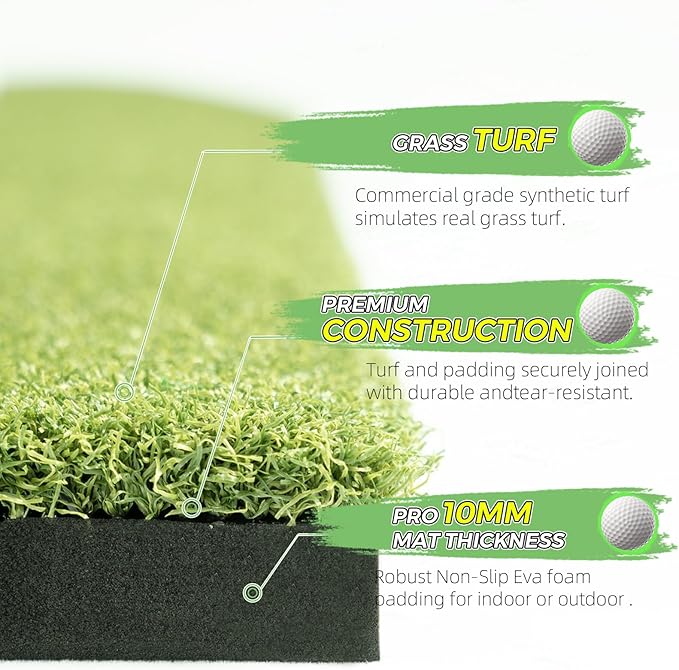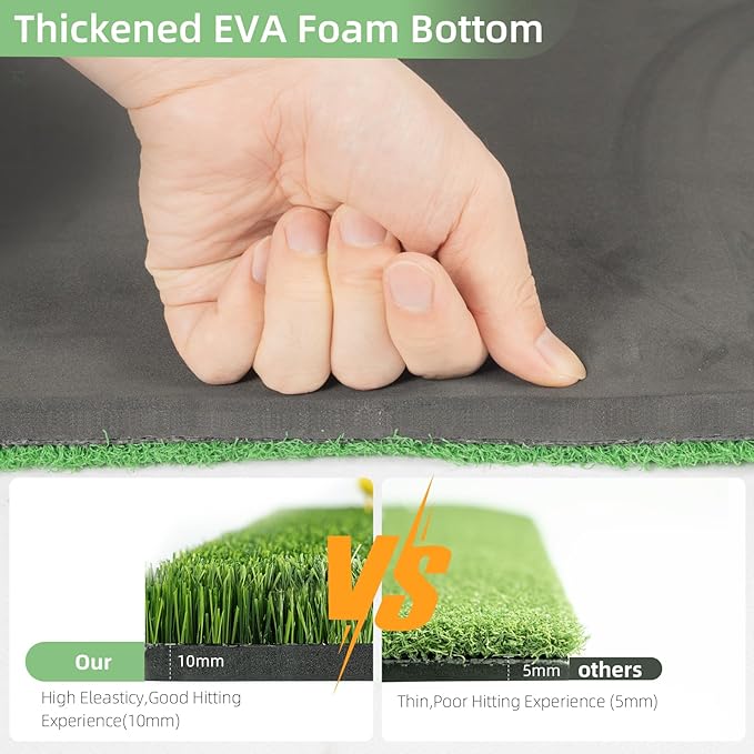 プレミアム品質: ゴルフ練習用マットターフは高密度で環境に優しい PP 素材で作られており、厚みのある 15mm の EVA 底部は滑り止め機能と弾力性があり、長期間の練習に耐える耐久性を備えています。同時に、厚みが増すほど衝撃を吸収し、練習スイングやチッピング中に手首、肘、肩を保護します。