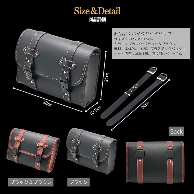 【サイズ】28cm 21cm 10.5cm 、重さ約480gになります。カラーバリエーションはブラックとブラウン&ブラックの2種類をご用意いたしました。 お持ちのバイクに合わせてお選びください。