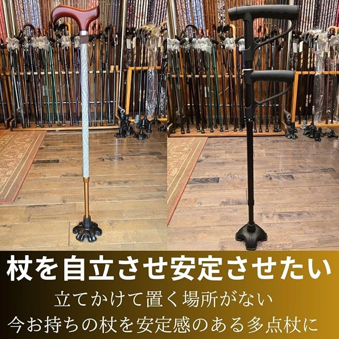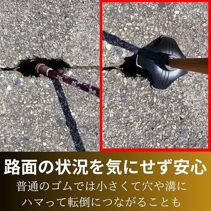 ✅杖が自立する安定の軽量4点式ゴム(通常の路面用です、雪道、凍った道用ではありません)大きくなると重くなりがちですが、比較的軽量なTPR素材を採用することで、軽すぎず、重すぎずの安定感がある、新しい溝パターンの4方向形状の杖ゴムを開発しました。杖ゴムの着地面を広くしたことで安定性も格段にアップ。「近江一文字の4点式自立する杖の先ゴム」は使い心地がアップします。※ゴムが軽すぎると安定せず杖が倒れます。