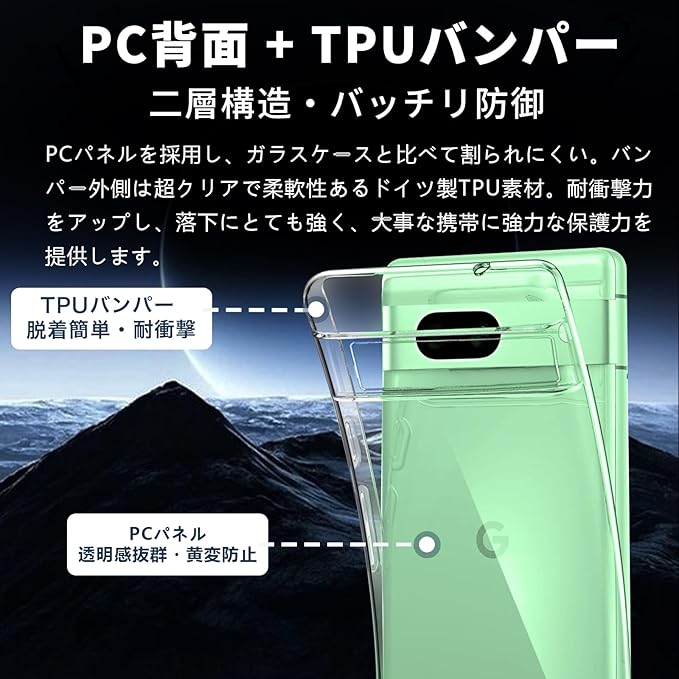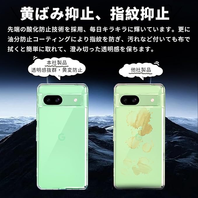 【極上の透明感・黄変防止】ケースは透き通った99%高い透明度を誇り。驚きほどの透明感、美しさをしっかりキープ、Phone本体のカラーを活かせて、背面がクリアなので好きなシールや写真を入れてカスタマイズOK。Phone本体の美しさを引き立たせて端末を衝撃と傷から保護します。ピクセル 8a 用ケースは黄ばみに強いソフトTPU素材と耐候性に優れたPCパネルを厳選し、研究データにより、黄変耐性が普通製品より20倍も高く、従来手法よりも88%の黄変防止を達成した。経年劣化による黄ばみも生じないから、澄み切った光沢感は、人を惹きつけてやみません。