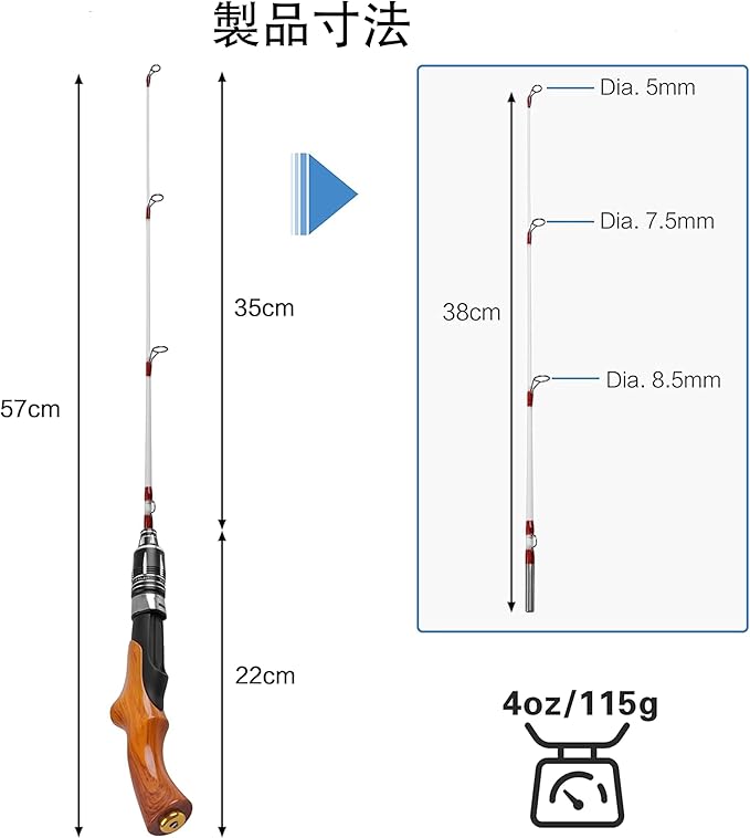 【仕様】仕舞寸法展開時全長約59cm、収納時約38cm。分割時:22cmハンドル部、約38cm元竿。標準自重:113g、継数:2、ガイド数:3+1。