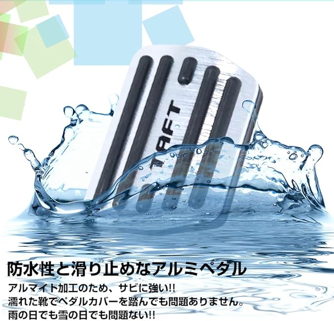 【素材】:アルミ素材を採用、ペダルの表面にヘアライン仕上げにアルマイト加工した、見た目の美しさと対腐食性、耐摩耗性を兼ねています。見る角度によって光が反射、キラキラとした輝きが高級感を上げてくれます。ドライブの安全性を向上するために脱落防止ラバーが固めになっています。装着しにくい場合は脱落防止ラバーを手で開き、滑り込ませるように差し込んでください。