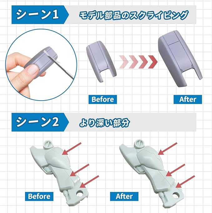 【細かい部品の加工】細かい部位の作業がより効率的に行えるスジ彫り タガネセットです。プラモデル 工具セットはガンプラ、ミニ四駆、フィギュア、プラモデル、模型などの小物パーツの彫刻に便利です。パネルラインやモールドを綺麗に引きたい時に重宝します。 ※スジボリ タガネはプラスチック、木材、革製品、紙材等にお使いいただけますが、金属には適しません。