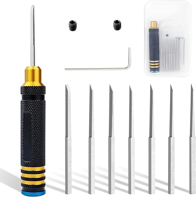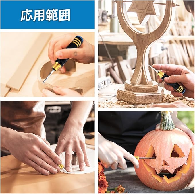 【簡単操作で交換可能】筋彫り セットで適切な刃を選択してください、刃をグリップに差し込んだ後、グリップの穴に向かって付属のネジを入れ、六角レンチで固定するだけでセット完了です。手軽に交換できるのでより繊細でこだわった製作が叶います。( ※スジボリ 彫刻刀 は防錆の為に少し油が塗布されていますが、多少変色がある場合がございますので予めご了承ください。)