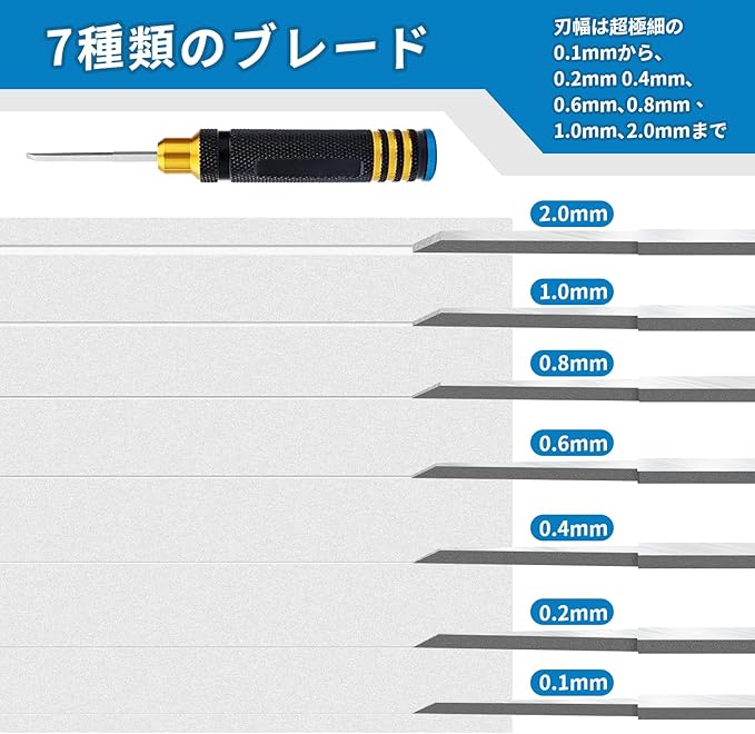 【7種類の刃が交換可能】スジボリ堂 ガンプラ 刃先には高硬度で耐摩耗性に優れた高速度鋼を使用しており、切れ味が良く耐久性があり操作性が良く、シャープで美しいラインを彫ることができます。スジボリ タガネ セットは刃幅は超極細の0.1mmから、0.2mm、0.4mm、0.6mm、0.8mm、1.0mm、2.0mmまで7種類のブレードをご用意。シーンに合わせて交換可能です。