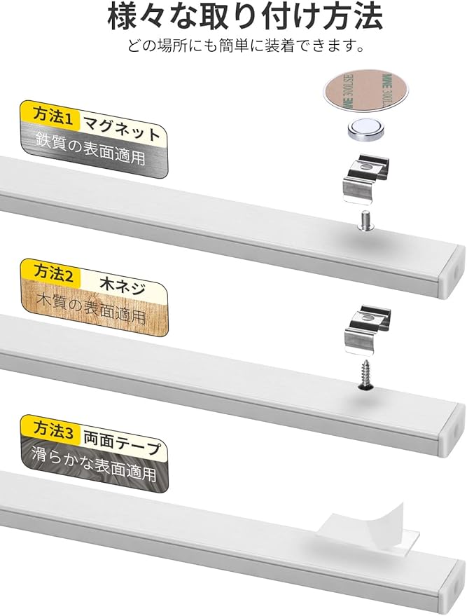 【強力マグネット/両面テープ取付】強力マグネットと両面テープ付きます。工事不要、どこでも簡単に取り付けられできます。 インテリア、ガレージ、廊下、足元、天井、シーリング、カーポート、納戸、浴室、洗面所、洗面台、部屋、物置、倉庫、リビング、などに設置して活躍します。