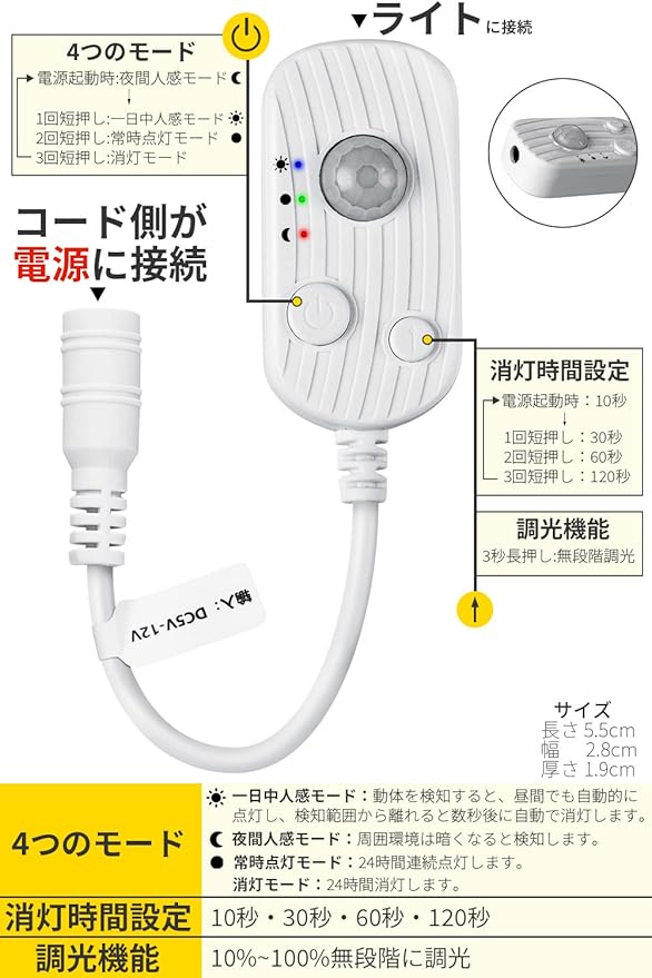【4モード 夜間/一日中/常時点灯/消灯】四つのモード切り替え可能です。①夜間人感モード:暗がりの中に動体検知して自動的に点灯し、動体静止を感知した数秒後に自動的に消灯します。②一日中人感モード:人感センサーは明るい環境でも動作します。③常時点灯モード:24時間点灯し、自動消灯しません。④消灯モード。