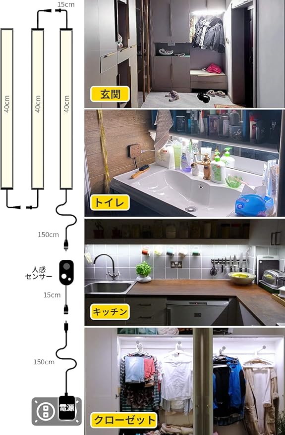 【ご注意:もし消灯しない】もし消灯しない場合は、センサー部の接続が逆になっている可能性があります。人感センサーのコード側に電源を接続用です。そうしないと人感センサーの機能が反応しません、ライトも消灯しません。