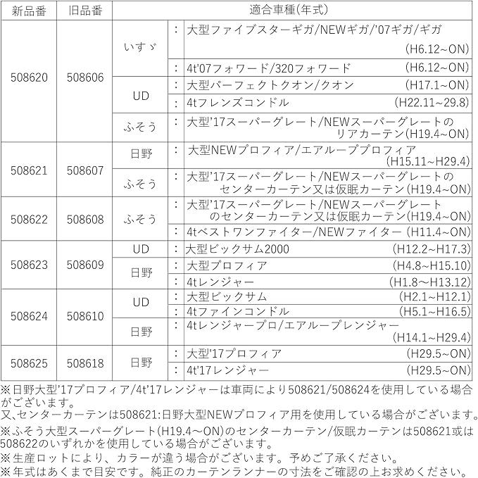 適合車種:いすゞ大型ファイブスターギガ/ギガ(H6.12~ON)/4t ’07フォワード/320フォワード(H6.12~ON)、UD大型パーフェクトクオン/クオン(H17.1~ON)/4tフレンズコンドル(H22.11~H29.8)、ふそう大型’17スーパーグレート/NEWスーパーグレートのリアカーテン(H19.4~ON)