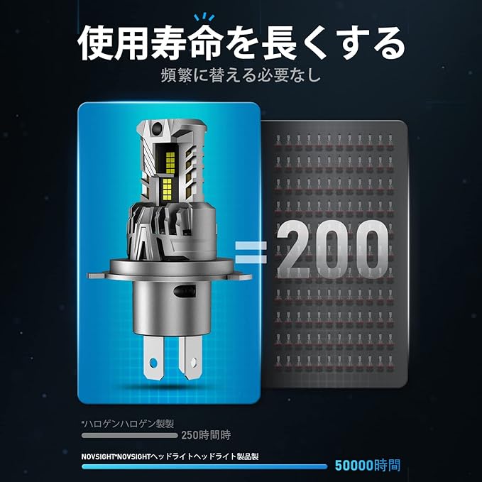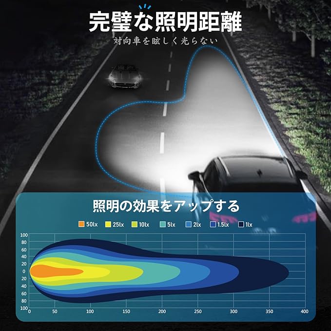 【高輝度チップ搭載】高性能LEDチップを採用して、精確な配光によって高輝度の発光ができます。ルーメン輝度やパワー値が他の製品より高く、爆光な照明効果が実現できます。ヘッドライトの明るさはハロゲンより300%以上実現します。夜間の走行が非常に楽になり、安全の走行を.します。