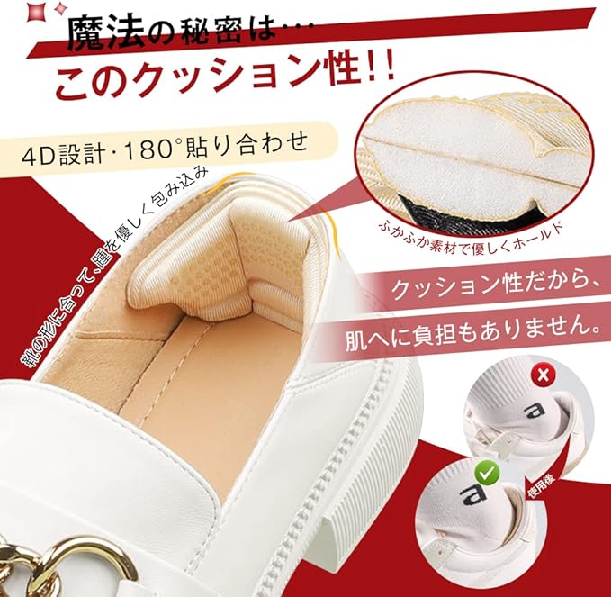 【4Dデザインズレ防止】かかとにフィットするために最新バージョンの4Dデザインのかかとパッドは足の痛み、靴ずれた状況に最適です。に基づいて、4Dデザインより下左右4方向死角なしで、優しくかかとを包みます。!表面に滑り止めのシリコン粒子を追加し、フィット感が良くて、パンプスやスニーカーなどの靴を履く時、靴ズレや靴のサイズ調整に困りのお客様に最適な足裏サポーターです。
