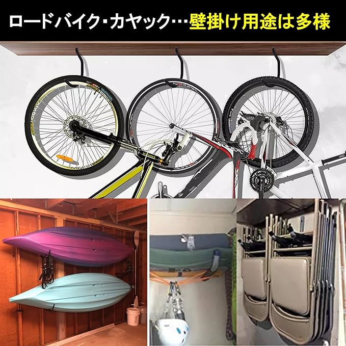 頑丈なスチール構造のガレージフック4本セットです。ネジとアンカーを各8本付属し直ぐ取付けることができます。表面に粉体塗装で防錆処理を施しており耐久性に優れたガレージフックです。