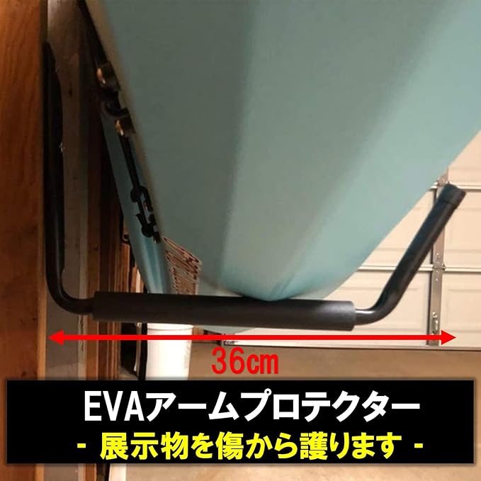 耐荷重量は約25㎏/フック1個で、幅が約36㎝とワイドな仕様となっており、カヤックやカヌー等、大型展示収納物に適しています。
