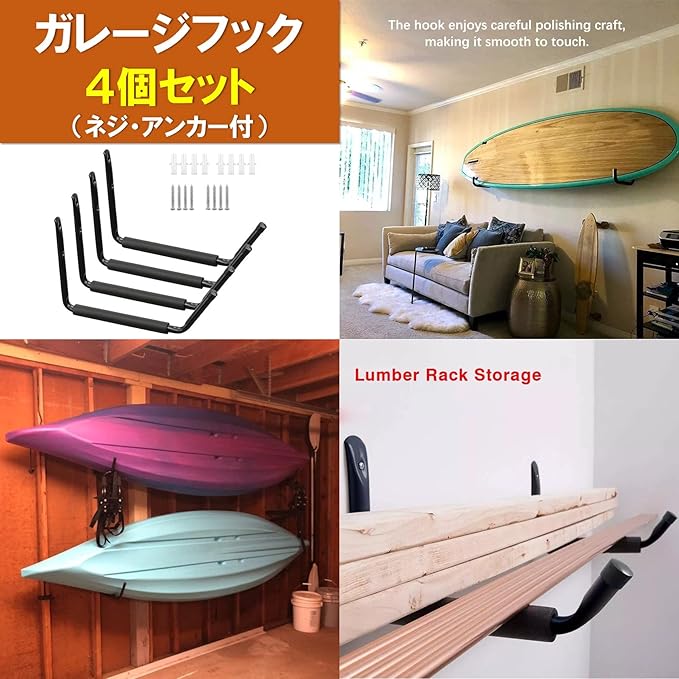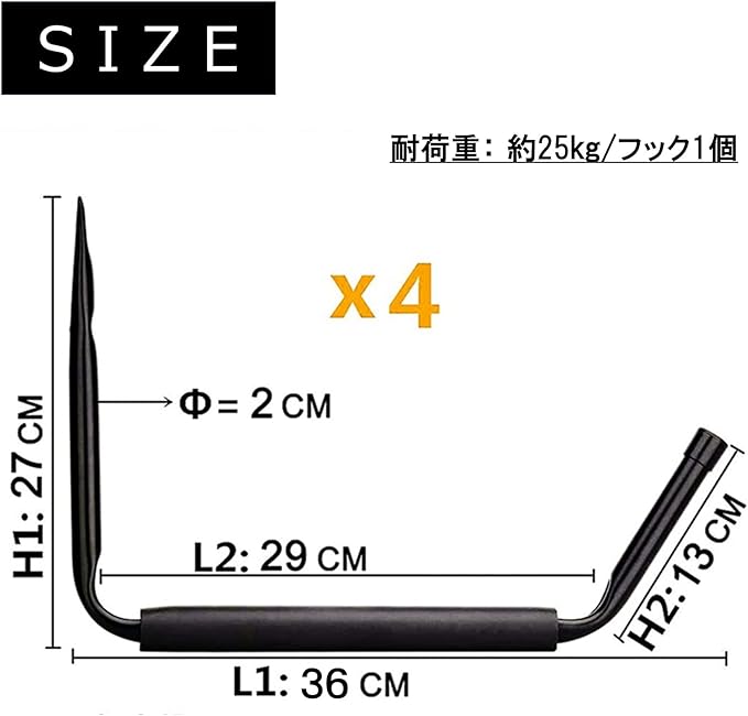 商品詳細:ガレージフック4本セット(ネジ・アンカー付き)【サイズ】約 幅36 高さ27 径2㎝ 【耐荷重量】約25㎏/フック1個 【材質】鋼管製