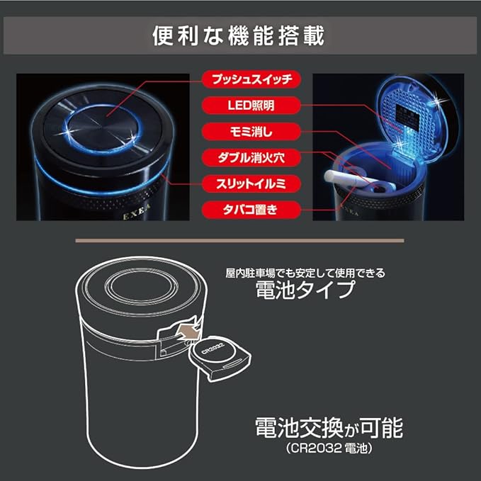 ワンタッチでON/OFFが自在、電力消費を抑えられて、電池も交換できる エコ仕様です。(使用電池:CR2032)