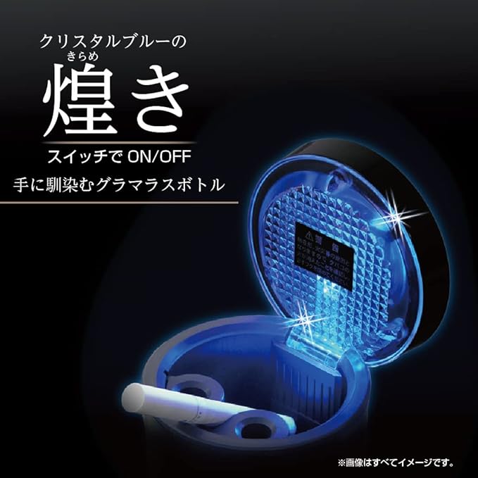 スピンカット・トップにブルーのダブルリングイルミが浮かび上がる灰皿です。