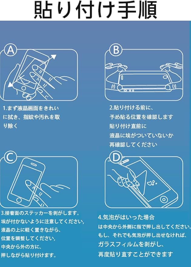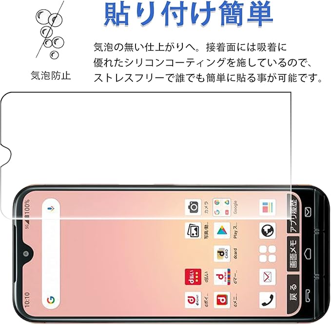 【貼り付けは簡単です】気泡が入りにくく、初心者でも完璧に貼り付けられます、角を合わせてポンと中心を押すだけで貼りつけ完了、自己吸着機能!気泡が発生しにくいので、綺麗に貼り付けられます。 撥油コーティング加工されているため、耐油性に優れ、指紋付きにくく、付着した汚れも簡単に拭き取れます。液晶画面の発色を損なうことはなく、精確なタッチ感、スライドしても引っかかり感がなく、さらさら手さわり、裸さながらの質感を実現します。画面上の操作も違和感なくスムーズに行えます。
