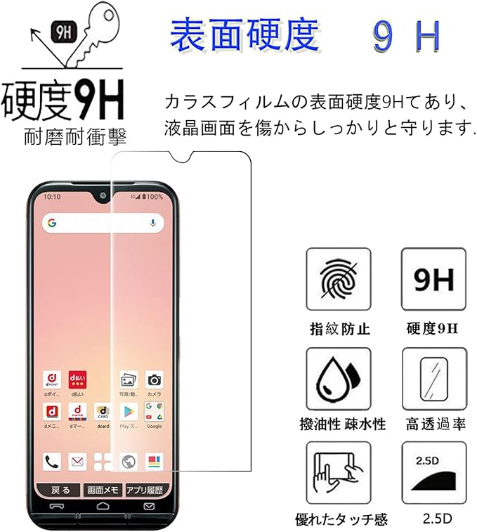【表面硬度9H】カッターなどの鋭利なものを当たってもキズが付きにくくて高い強度を持ち表面硬度9Hが特徴です。ハードコーティング技術は、衝撃を最小限に抑えて画面の破損を抑え、すり傷防止や指紋防止もしっかりとスクリーンを保護します。本体の端を完全に覆い、液晶画面を保護します。エッジの衝撃が軽減され、ガラス膜の耐久性も向上しました。万が一の破損時も飛散防止加工によって破片はフィルムに張り付いた状態で破片がほとんど飛び散らない安全性の高いガラスになっています。
