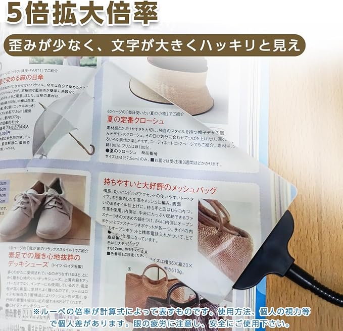 【5倍拡大倍率】目に負担をかけず視野と見やすさを追求した、ルーペ5倍!非球面レンズ(フレネルレンズ、素材:アクリル)を使用しており、レンズ外周部の歪みが少なく、文字が大きくハッキリと見えます。透明度がとてもクリアです!