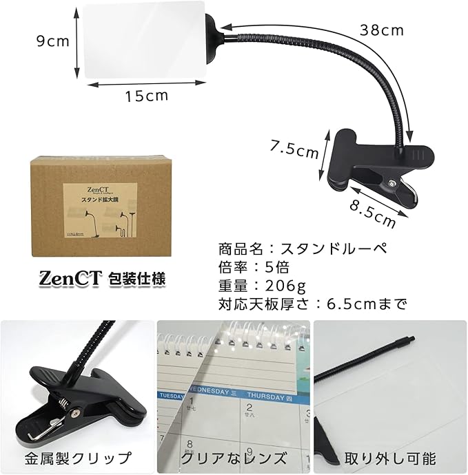 ZenCT スタンドルーペ 拡大鏡 5倍 四角形 クリップ式 読書用 スタンド レンズ 虫眼鏡 高倍率 360 角度調整可能 新聞 地図 ジュエリー 手芸 プレゼント CT182 | oioioichan