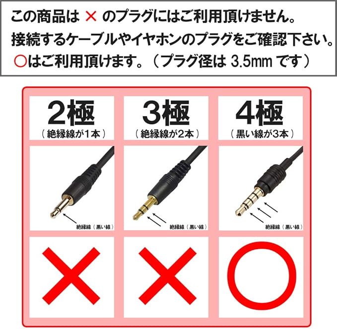 ※2極(モノラル)または3極(ステレオ)のプラグやケーブル、機器には対応しません。※プラグのサイズ(大きさ)を変換するものです。信号変換はできません。バランス駆動のイヤホンとスマートホン(アンバランス)の接続には利用できません。バランス接続とアンバランス接続(CTIAやOMTP等)の変換はできません。必ず接続機器の仕様(規格)をご確認下さい。