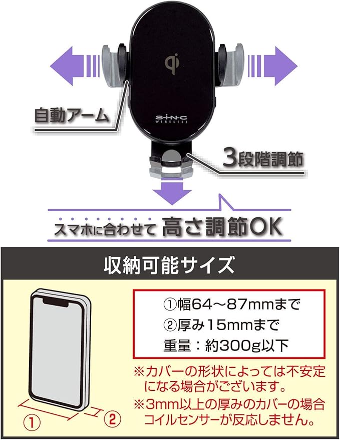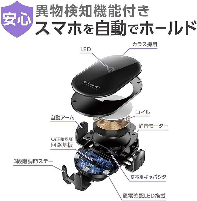 自動でアームが可動する、Qi正規認証ワイヤレス充電機能内蔵の車載携帯電話ホルダー。手帳型ケース対応