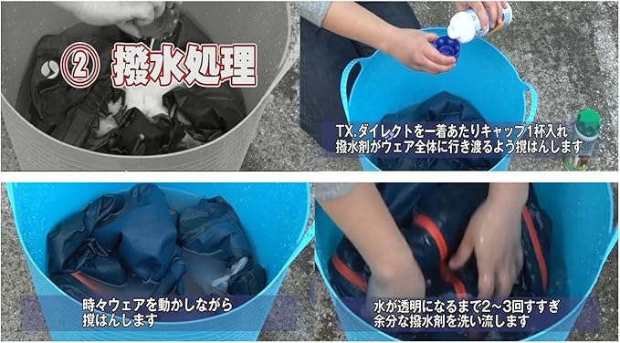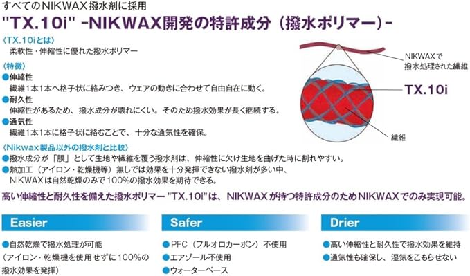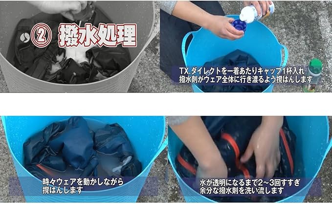 商品(左): 撥水性を補い、通気性を確保し、結露を抑えます。レインウェア等の洗濯後、そのまま洗濯機で撥水加工できます。