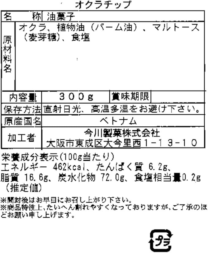 原材料名:オクラ、植物油(パーム油)、マルトース(麦芽糖)、食塩