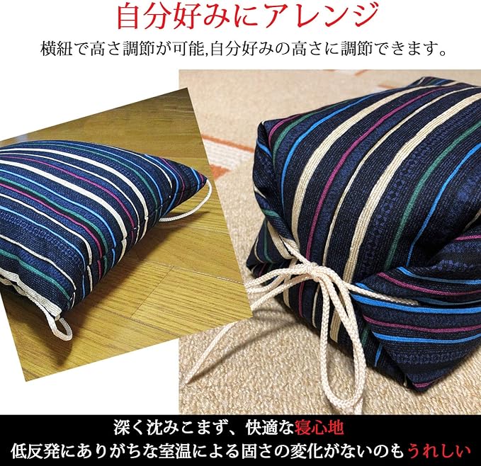 横紐の結わき方で自分好みの高さに調節できます。低反発枕にありがちな室温による硬さの変化もありません。和テイストの落ち着いた柄と色合いで男女共にお使いいただけます。サラサラ涼し気は手触りが暑い季節にもピッタリです。