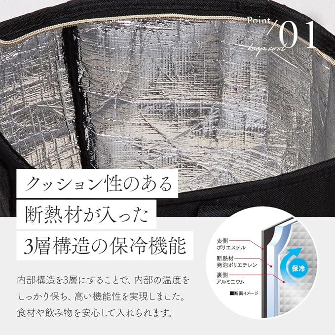 【3層構造の保冷機能】クッション性のある断熱材が入った3層構造の保冷機能。内部構造を3層にすることで内部の温度をしっかり保ち、高い機能性を実現しました。
