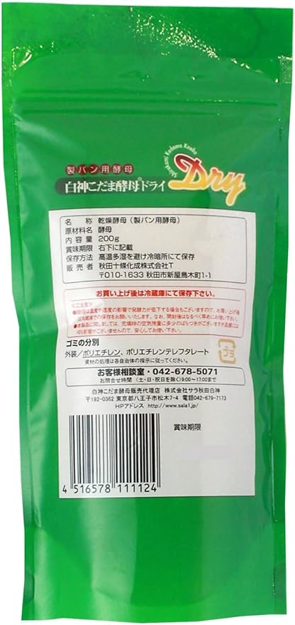 使用上の注意:お買い上げ後は冷蔵庫での保管を推奨します。 酵母は温度や湿度の影響で発酵力が低下する場合もございます。 開封後は、冷蔵庫で保管し、お早めにお使い下さい。 酵母は冷凍しないでください。 酵母乾燥の工程で色調の異なる酵母が発生する場合がございますが、.品質規格を満たしておりますので、安心してお使い下さい。 充填時の空気残量に多少のばらづきがございますが品質には何ら影響がございません。